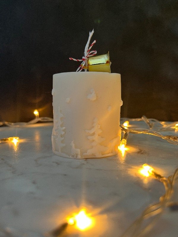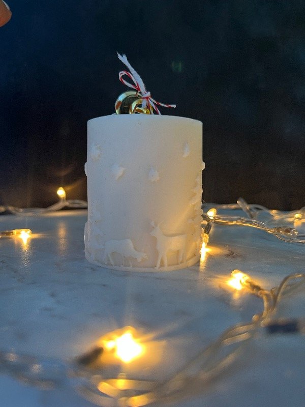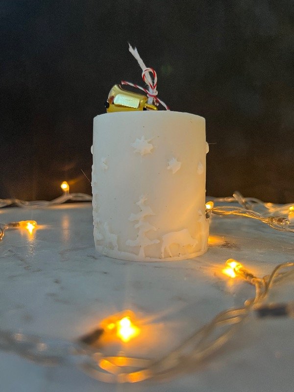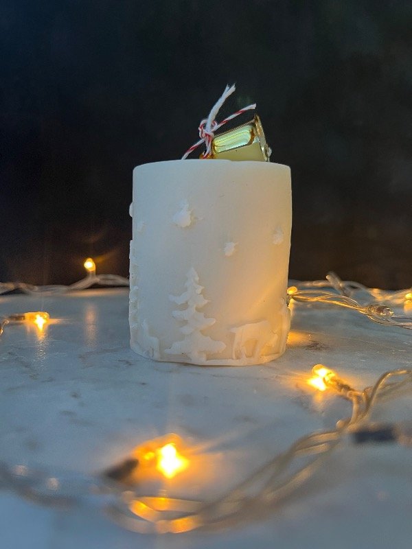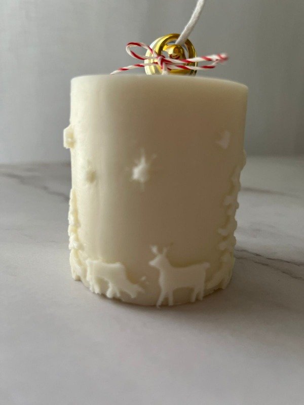 Vela de cera de Soja natural hecha en molde de silicona en forma de Tubo con figura de Árbol y Reno